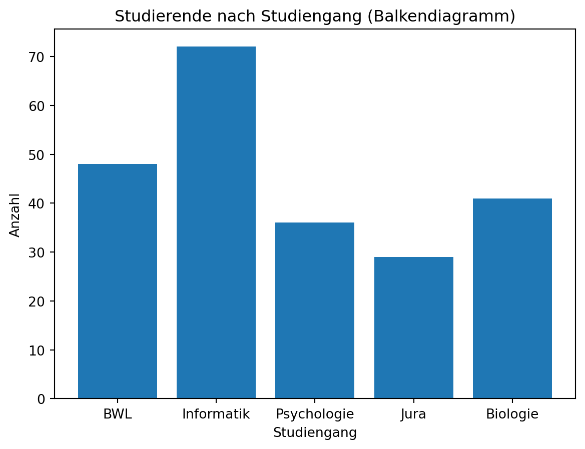 Jeder Balken repräsentiert die Häufigkeit (absolut oder relativ) einer Kategorie.Beispiel: Die Anzahl der Studierenden in verschiedenen Studiengängen.