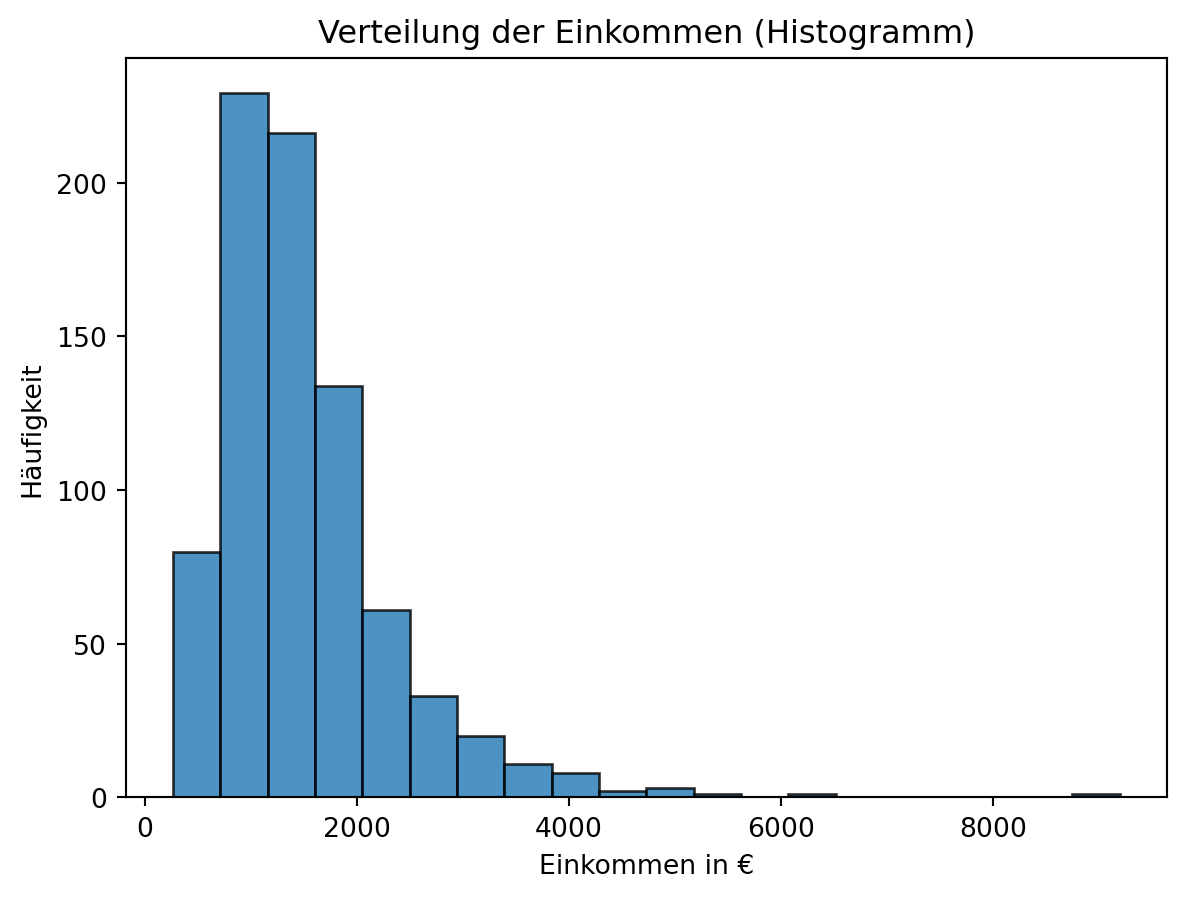 Die Balken stehen direkt nebeneinander und zeigen die Häufigkeit in jedem Intervall.Beispiel: Verteilung der Einkommen in einer Befragung.
