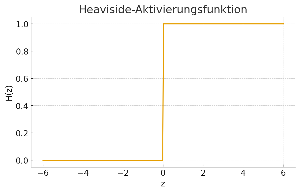 Alle diese Komponenten – Eingabewerte, Gewichte und Bias – werden zu einer einzigen Zahl kombiniert. Erst danach kommt die Aktivierungsfunktion \(f\) ins Spiel. Sie entscheidet, ob das Neuron ein Signal weitergibt oder nicht. In der einfachsten Form, der Heaviside-Funktion, geschieht dies durch einen klaren Schwellwert: Wird dieser überschritten, lautet die Ausgabe 1, ansonsten 0.